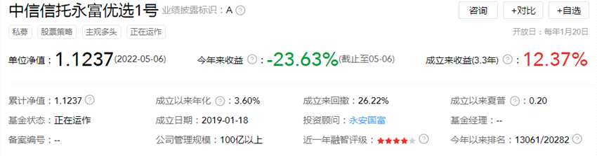 業(yè)績(jī)墊底的中信信托永富優(yōu)選1號(hào)成立于2019年1月18日,為股票策略型私募,截至2022年5月6日,該基金今年來(lái)收益率為-23.63%,在同類基金中排名中游偏后,成立來(lái)收益率為12.37%,累計(jì)凈值為1.1237元。