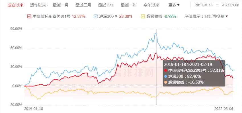 2021年2月19日,中信信托永富優(yōu)選1號(hào)的收益率達(dá)到成立以來(lái)最高值,截至當(dāng)日,該基金實(shí)現(xiàn)52.31%的累計(jì)漲幅,而同期滬深300漲幅則達(dá)82.40%,超額收益6.50%。