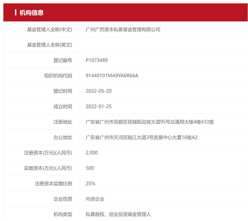 5月20日,一家名為“廣州廣藥資本”的私募基金管理人在中基協(xié)完成了備案。公開信息顯示,這家機(jī)構(gòu)成立于今年1月,注冊(cè)資本2000萬元,是一家私募股權(quán)、創(chuàng)業(yè)投資基金。