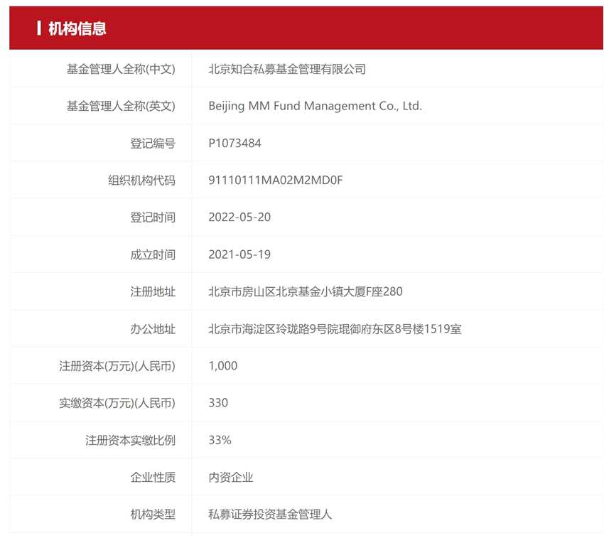 北京知合私募基金管理有限公司成立于去年5月,注冊(cè)資本1000萬元,共有5名全職員工。