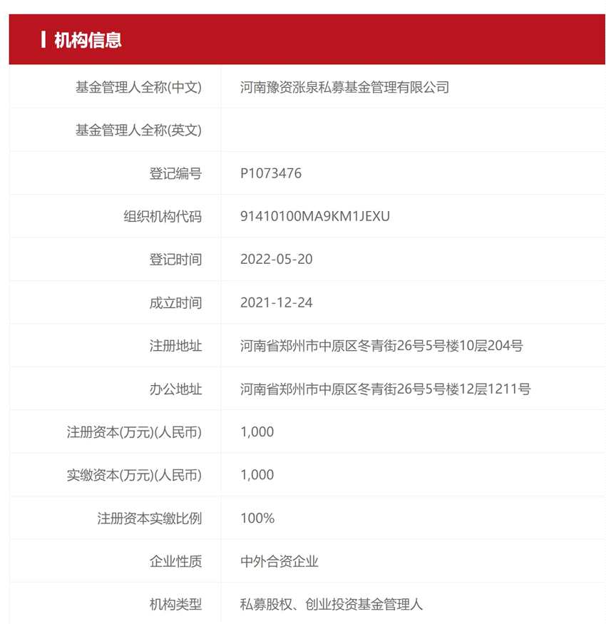 首先是成立于去年12月、剛剛完成備案的河南豫資漲泉私募基金管理有限公司。公開信息顯示,該機(jī)構(gòu)注冊(cè)資本1000萬元,是一家私募股權(quán)、創(chuàng)業(yè)投資基金管理人,全職員工有5名。