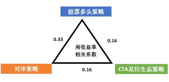 大類策略組內(nèi)基金的相關(guān)系數(shù)不高,對沖策略組內(nèi)成份基金的業(yè)績相關(guān)系數(shù)為0.27,股票多頭策略成份基金業(yè)績相關(guān)性為0.55,去除系統(tǒng)性影響后并不高,CTA與衍生品策略組內(nèi)相關(guān)系數(shù)為0.45。