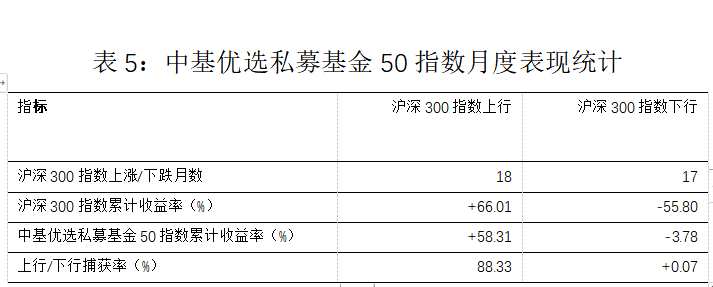 2019年7月以來,滬深300指數(shù)有18個(gè)月上漲,累計(jì)上漲幅度為66%,中基私募50指數(shù)在這些月份中漲幅達(dá)到58%,從比例上看捕獲了滬深300指數(shù)近88%的漲幅,表明中基私募50指數(shù)幾乎完全獲得了滬深300指數(shù)上漲時(shí)的收益,顯示出優(yōu)異的收益捕獲能力。