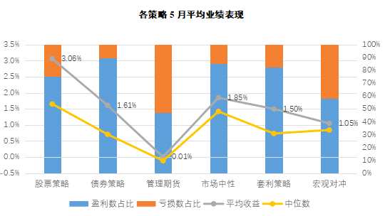 據(jù)朝陽(yáng)永續(xù)數(shù)據(jù)顯示,5月各策略全面回暖。Beta策略中,隨著股市反彈,股票策略平均盈利3.06%,管理期貨平均盈利僅0.01%,盈利數(shù)占比不足50%。Alpha策略中,中性策略取得今年以來(lái)最佳月度表現(xiàn),平均收益為1.85%,超過(guò)80%的產(chǎn)品獲得正收益。