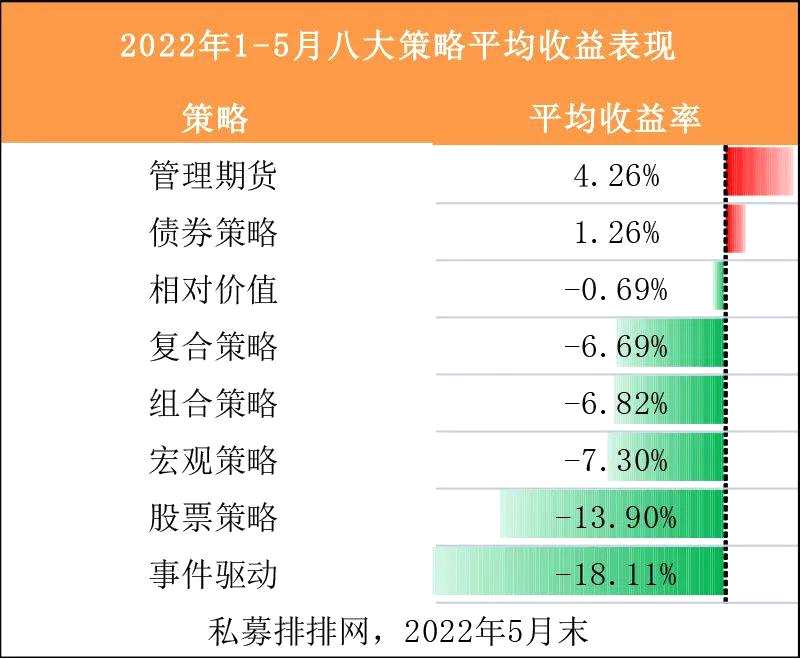 私募排排網(wǎng)最新數(shù)據(jù)顯示,今年前五個(gè)月僅有管理期貨策略、債券策略保持正收益。截至5月底,納入統(tǒng)計(jì)的2103只管理期貨策略私募基金今年以來(lái)平均收益率為4.26%,而股票策略,今年前五個(gè)月該策略平均回撤近14%。