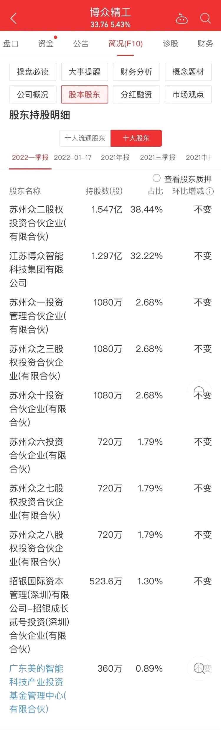 雖然南土資產(chǎn)旗下私募產(chǎn)品合計持有博眾精工流通股的比例高達(dá)34.85%,但是從博眾精工的前十大股東名單來看,公司第三大股東蘇州眾一投資管理合伙企業(yè)(有限合伙)持股1080萬股,占總股本的比例為2.68%,還沒有達(dá)到5%的舉牌線。而南土資產(chǎn)合計持有博眾精工1357.578萬股。