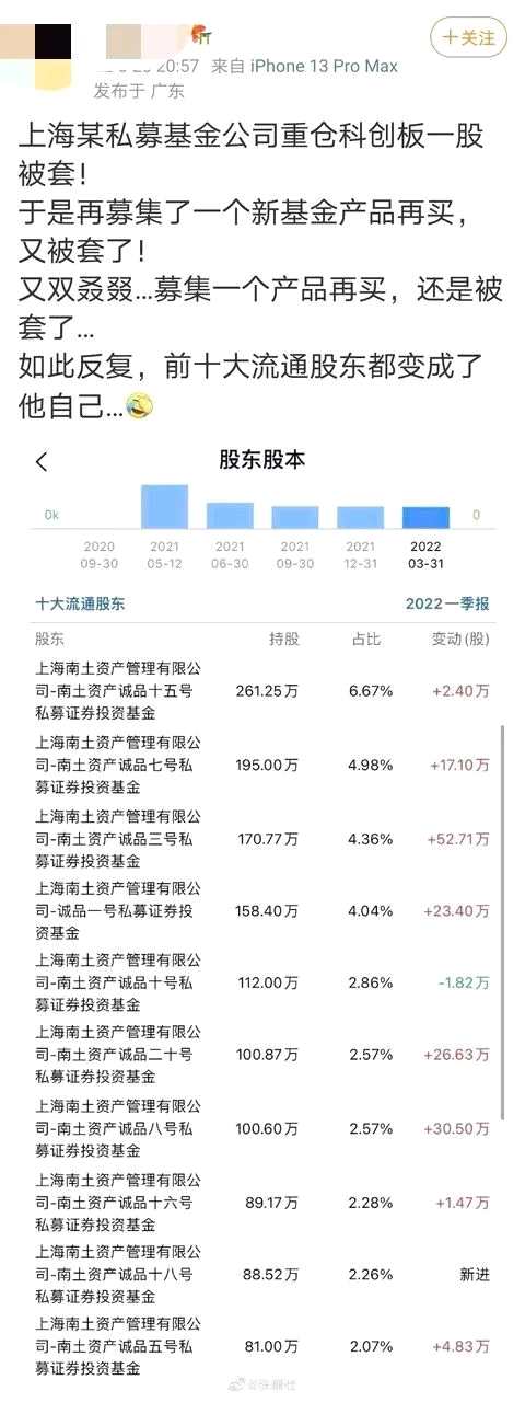 近日,上海一家私募火了。有大V在微博稱,上海某私募基金公司重倉科創(chuàng)板一股被套!于是再募集了一個新基金產(chǎn)品再買,又被套了!又雙叒叕……募集一個產(chǎn)品再買,還是被套了……如此反復(fù),前十大流通股東都變成了他自己。