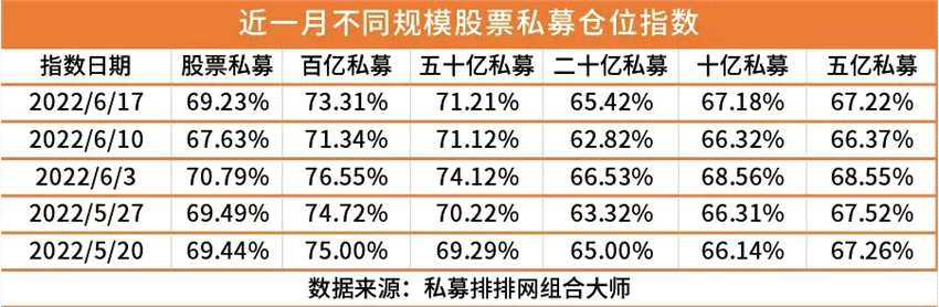 私募排排網最新數據顯示,6月以來,股票私募倉位指數持續(xù)回暖。截至 6月17日,股票私募倉位指數為69.23%,環(huán)比前一周提高0.81個百分點。其中,百億級私募倉位最高,加倉力度最大。截至6月17日,百億級股票私募倉位指數為73.31%,環(huán)比提高1.97個百分點。