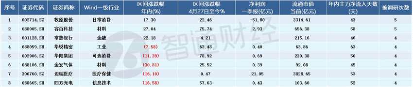 容百科技(688005.SH)、【牧原股份(002714)、股吧】(002714)(002714.SZ)獲高毅5次調(diào)研。金宏氣體(688106.SH)、華銳精密(688059.SH)、常熟銀行(601128)(601128.SH)、華陽(yáng)集團(tuán)(002906)(002906.SZ)、四方光電(688665.SH)、邁瑞醫(yī)療(300760)(300760.SZ)均獲4次調(diào)研。