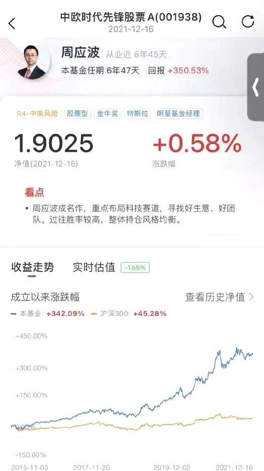 數據顯示,周應波的代表作中歐時代先鋒,在其擔任基金經理的6.13年期間任職回報達到345%,年化回報為27%,遠超同期滬深300。