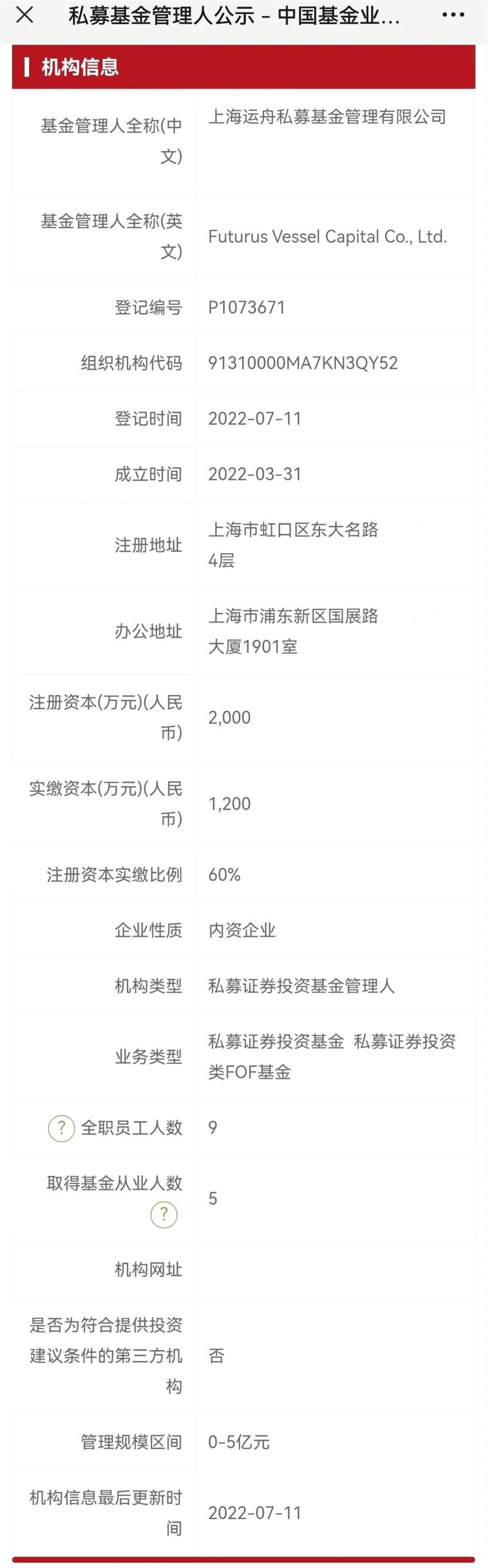 中國基金業(yè)協(xié)會官網顯示,上海運舟私募基金管理有限公司成立于今年3月31日,7月11日完成私募基金管理人登記。