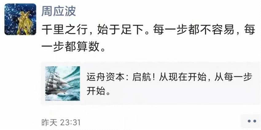 昔日公募六百億頂流已卸下所有包袱重新再出發(fā)。昨天深夜,周應(yīng)波發(fā)了一條朋友圈:“千里之行,始于足下。每一步都不容易,每一步都算數(shù)?!?/p>
