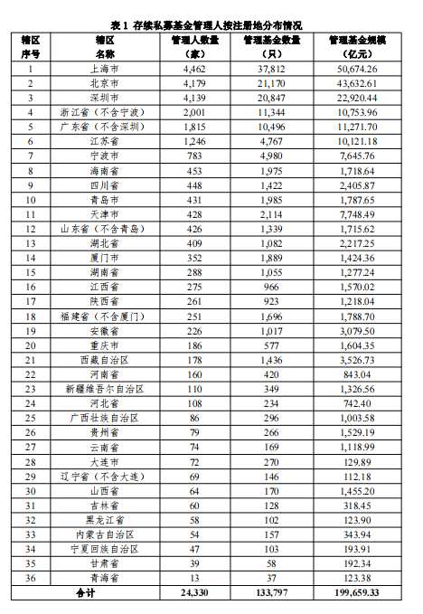 截至2022年6月末,已登記私募基金管理人數(shù)量從注冊(cè)地分布來(lái)看(按36個(gè)轄區(qū)),集中在上海市、北京市、深圳市、浙江?。ǔ龑幉ǎ┖蛷V東?。ǔ钲冢傆?jì)占比達(dá)68.21%,低于5月份的68.38%。其中,上海市4,462家、北京市4,179家、深圳市4,139家、浙江?。ǔ龑幉ǎ?,001家、廣東?。ǔ钲冢?,815家,數(shù)量占比分別為18.34%、17.18%、17.01%、8.22%和7.46%。