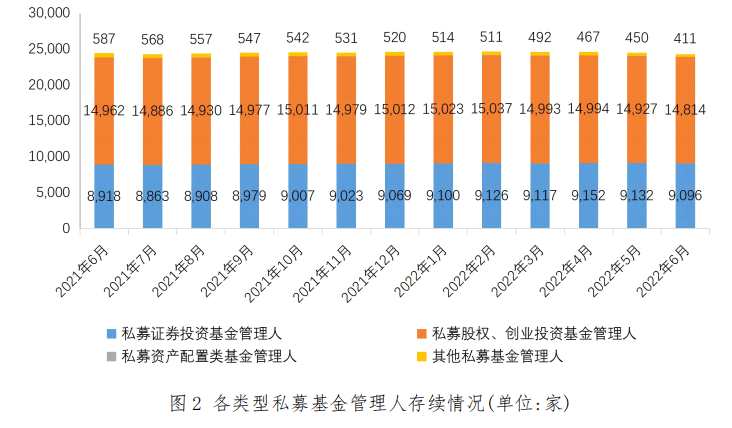 截至2022年6月末,存續(xù)私募基金管理人24,330家,較上月減少188家,環(huán)比下降0.77%;管理基金數(shù)量[1]133,797只,較上月增加1,061只,環(huán)比增長(zhǎng)0.80%;管理基金規(guī)模[2]19.97萬(wàn)億元,較上月增加41.61億元,環(huán)比增長(zhǎng)0.02%。其中,私募證券投資基金管理人9,096家,較上月減少36家,環(huán)比下降0.39%;私募股權(quán)、創(chuàng)業(yè)投資基金管理人14,814家,較上月減少113家,環(huán)比下降0.76%;私募資產(chǎn)配置類基金管理人9家,與上月持平;其他私募投資基金管理人411家,較上月減少39家,環(huán)比下降8.67%。