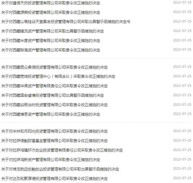 7月25日,西藏證監(jiān)局對私募基金一次性開出19張罰單!具體來看,19張罰單中有6張罰單在2020年年末,13張罰單在2019年。其中西藏暖流資管、西藏山南硅谷天堂昌吉、西藏國安睿博、堆龍航遠(yuǎn)創(chuàng)融創(chuàng)業(yè)4家私募基金被出具警示函,另外15家私募則被責(zé)令改正。