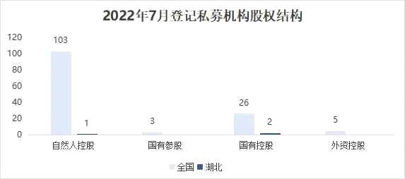 全國(guó)7月登記的137家私募基金管理人中,有103家私募基金管理人完全由自然人股東出資,占比約75.18%。另有26家為國(guó)有控股,有3家為國(guó)有參股,有5家為外資控股。
