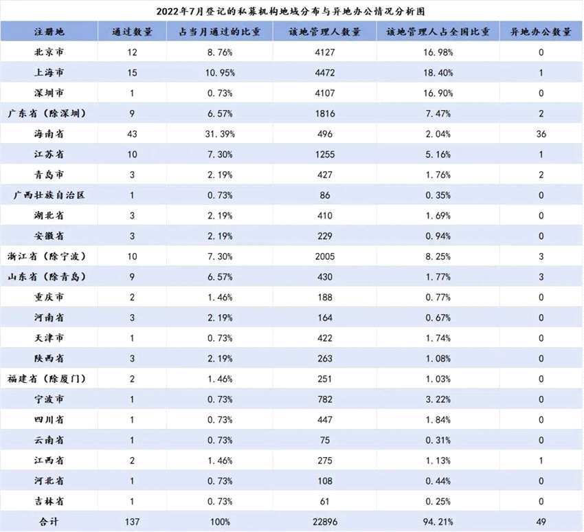 全國(guó)7月登記的137家私募基金管理人中,海南省為私募機(jī)構(gòu)新增數(shù)量前三的注冊(cè)地,上海市、北京市則分別躍居第二、第三;其中海南省通過(guò)數(shù)量多達(dá)43家。