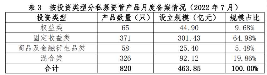 從投資類型看,7月備案私募資管產(chǎn)品數(shù)量最多、設(shè)立規(guī)模最大的為固定收益類(見表3)。