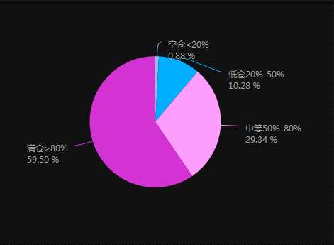 具體來看,倉位超過8成股票私募占比為59.50%,倉位介于5-8成之間的股票私募占比為29.34%,倉位介于2-5成之間的股票私募占比為10.28%,倉位低于2成的股票私募占比為0.88%。
