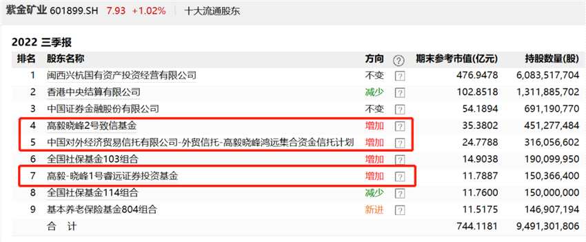 10月21日晚,紫金礦業(yè)披露三季報(bào)。公告顯示,截至三季度末,私募大佬高毅資產(chǎn)鄧曉峰管理的高毅曉峰2號(hào)致信基金、外貿(mào)信托-高毅曉峰鴻遠(yuǎn)集合資金信托計(jì)劃、高毅-曉峰1號(hào)睿遠(yuǎn)證券投資基金這三只產(chǎn)品,分別持有紫金礦業(yè)4.51億股、3.16億股和1.50億股,合計(jì)持有約9.18億股,合計(jì)持倉(cāng)市值約72億元。對(duì)比二季度末來(lái)看,合計(jì)增持約2600萬(wàn)股,按照區(qū)間成交均價(jià)計(jì)算,合計(jì)增持金額約2.29億元。