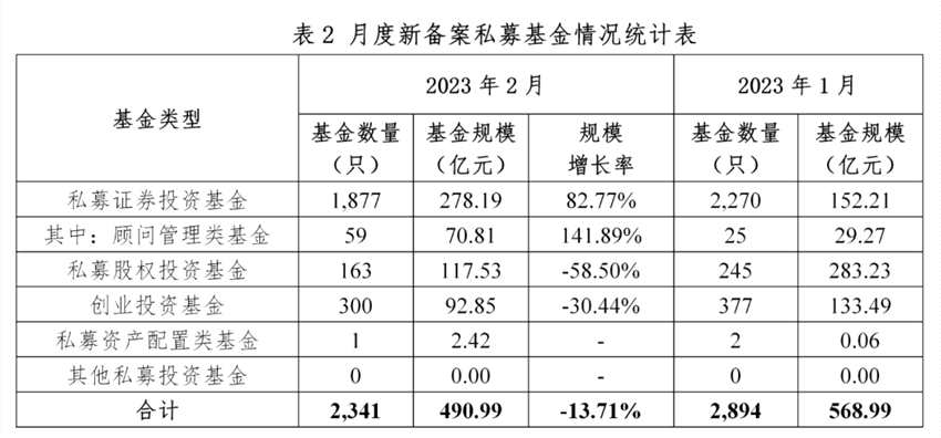 2023年2月,新備案私募基金數(shù)量2,341只,較上月減少553只,環(huán)比下降19.11%;新備案規(guī)模490.99億元,較上月減少78.00億元,環(huán)比下降13.71%。其中,私募證券投資基金1,877只,占新備案基金數(shù)量的80.18%,新備案規(guī)模278.19億元,環(huán)比增長82.77%;私募股權投資基金163只,新備案規(guī)模117.53億元,環(huán)比下降58.50%;創(chuàng)業(yè)投資基金300只,新備案規(guī)模92.85億元,環(huán)比下降30.44%;私募資產(chǎn)配置基金1只,新備案規(guī)模2.42億元。