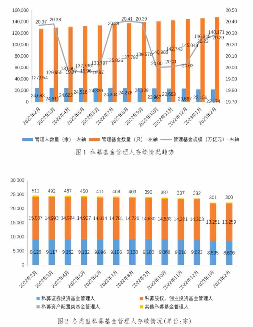 3月13日,中國證券投資基金業(yè)協(xié)會發(fā)布2023年2月私募基金管理人登記及產(chǎn)品備案月報。數(shù)據(jù)顯示,截至2023年2月末,存續(xù)私募基金管理人22,174家,較上月增加18家,環(huán)比增長0.08%;管理基金數(shù)量148,171只,較上月增加1,826只,環(huán)比增長1.25%;管理基金規(guī)模20.29萬億元,較上月增加510.11億元,環(huán)比增長0.25%。其中,私募證券投資基金管理人8,606家,較上月增加11家,環(huán)比增長0.13%;私募股權、創(chuàng)業(yè)投資基金管理人13,259家,較上月增加8家,環(huán)比增長0.06%;私募資產(chǎn)配置類基金管理人9家,與上月持平;其他私募投資基金管理人300家,較上月減少1家,環(huán)比下降0.33%。