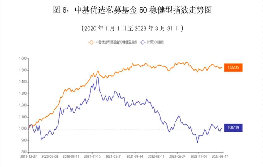 中基優(yōu)選私募基金50指數(shù)的首個二級指數(shù)——中基優(yōu)選私募基金50穩(wěn)健型指數(shù)(以下簡稱“中基50穩(wěn)健型指數(shù)”)的基準日為2020年1月1日,指數(shù)在2023年第一季度表現(xiàn)良好。
