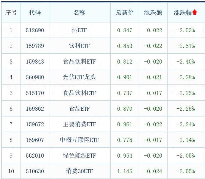 酒、飲料、食品、消費等相關ETF跌超2%。