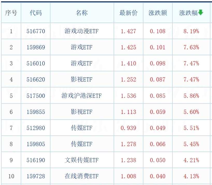 盤面上,多只游戲、影視、傳媒相關ETF漲超5%,其中游戲動漫ETF大漲8.19%。
