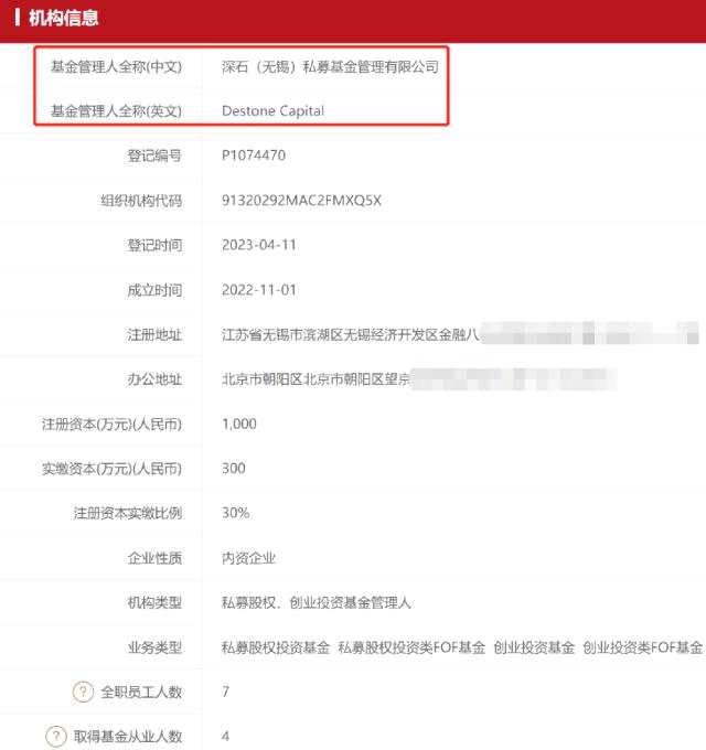 深石私募成立于2022年11月1日,于今年4月11日完成了登記,機(jī)構(gòu)類型為私募股權(quán)、創(chuàng)業(yè)投資基金管理人。公司的辦公地在北京朝陽區(qū),目前共有7名全職員工,其中有4位取得了基金從業(yè)資格。