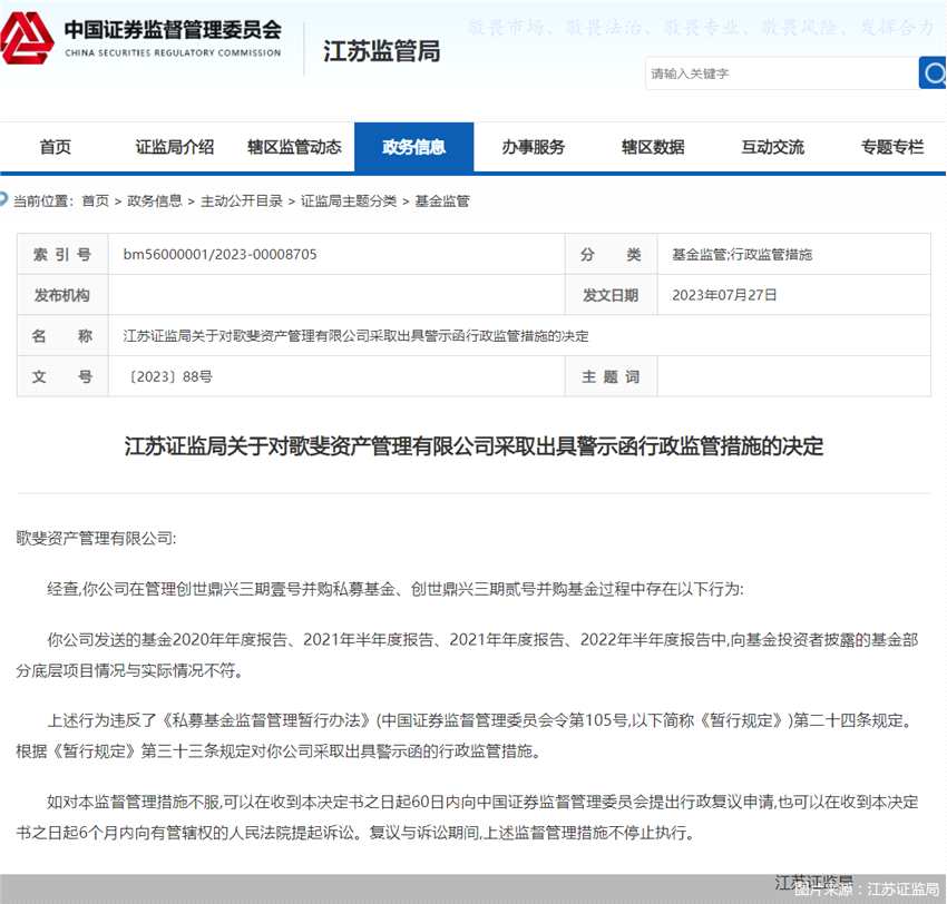 月2日,江蘇證監(jiān)局發(fā)布公告稱,經(jīng)查,歌斐資產(chǎn)管理有限公司在管理創(chuàng)世鼎興三期壹號(hào)并購(gòu)私募基金、創(chuàng)世鼎興三期貳號(hào)并購(gòu)基金過(guò)程中存在發(fā)送的基金2020年年度報(bào)告、2021年半年度報(bào)告、2021年年度報(bào)告、2022年半年度報(bào)告中,存在向基金投資者披露的基金部分底層項(xiàng)目情況與實(shí)際情況不符的違規(guī)行為。根據(jù)相關(guān)規(guī)定,江蘇證監(jiān)局對(duì)歌斐資產(chǎn)管理有限公司采取出具警示函的行政監(jiān)管措施。