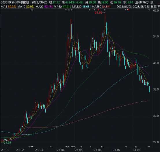 今年乘著AI的東風(fēng),中科曙光在股票市場(chǎng)中也火了一把,公司股價(jià)年初從22元附近啟動(dòng),到今年6月一度漲至61.20元/股的階段高位,但近兩個(gè)月調(diào)整也非常劇烈。截止8月25日收盤(pán),中科曙光報(bào)37.12元/股,最新總市值為543億元,今年總體漲幅仍然達(dá)到68.40%。