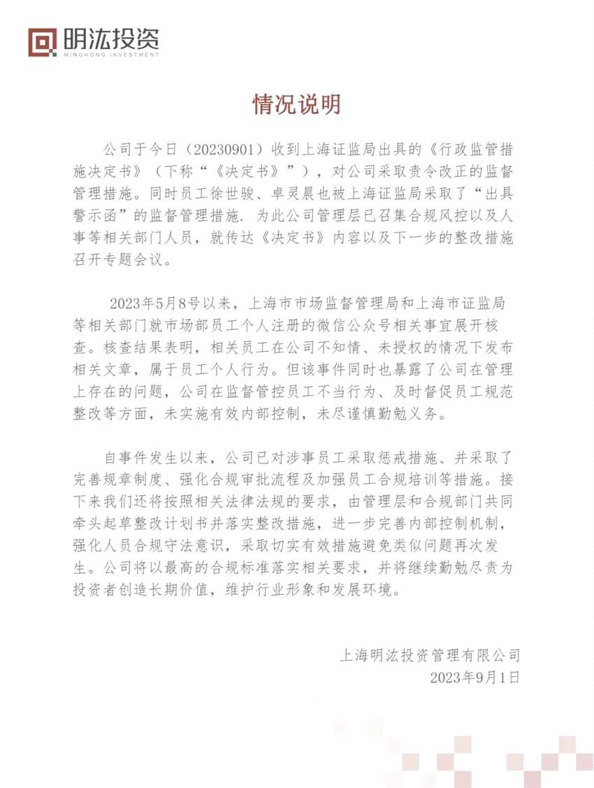 明汯稱,2023年5月8號以來,上海市市場監(jiān)督管理局和上海市證監(jiān)局等相關部門就市場部員工個人注冊的微信公眾號相關事宜展開核查。核查結果表明,相關員工在公司不知情、未授權的情況下發(fā)布相關文章,屬于員工個人行為。但該事件同時也暴露了公司在管理上存在的問題,公司在監(jiān)督管控員工不當行為、及時督促員工規(guī)范整改等方面,未實施有效內(nèi)部控制,未盡謹慎勤勉義務。