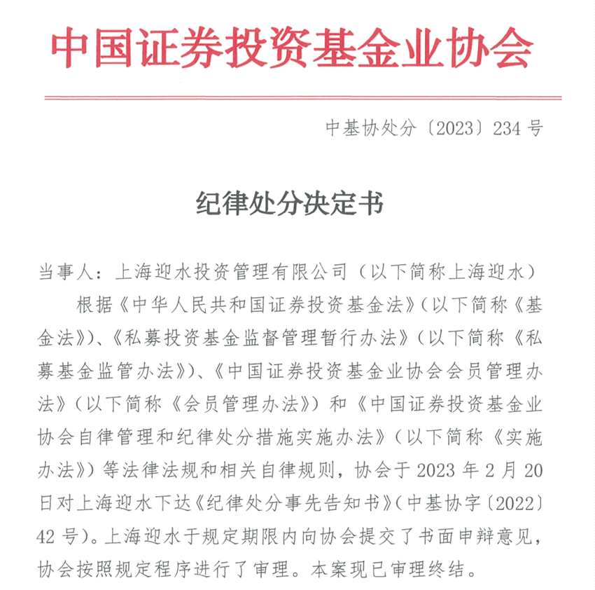 9月1日,中國證券投資基金業(yè)協(xié)會(以下簡稱中基協(xié))官網(wǎng)發(fā)布多份紀律處分決定書,其中幾份“劍指”百億級私募迎水投資。