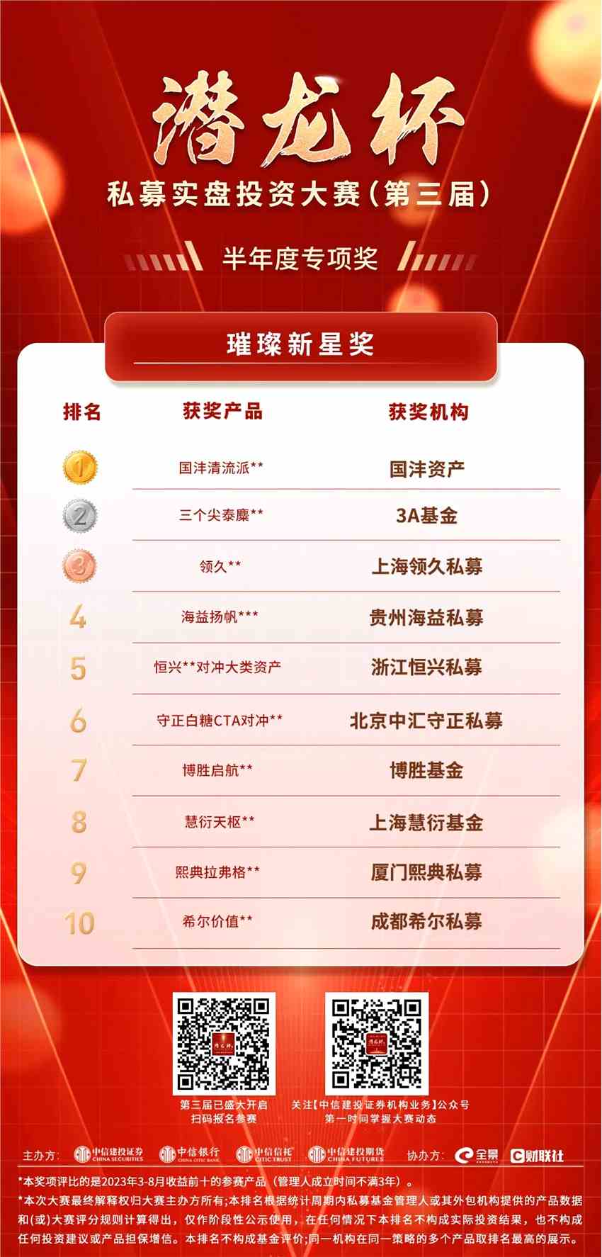 中信建投證券第三屆“潛龍杯”私募大賽第二賽季獎(jiǎng)項(xiàng)暨半年度專項(xiàng)獎(jiǎng)榜單揭曉,131家私募斬獲殊榮