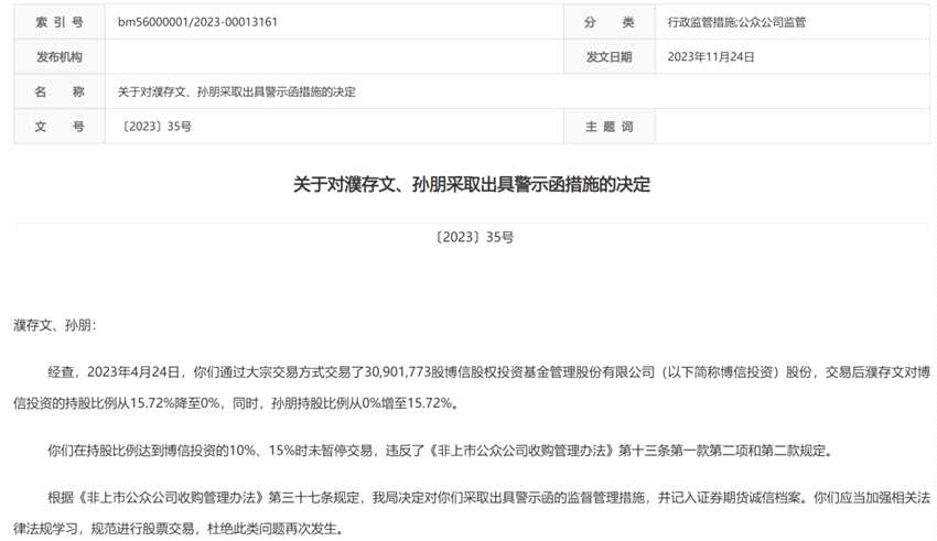 值得注意的是,11月24日,西藏證監(jiān)局還發(fā)布了另一份涉及博信投資的行政監(jiān)管決定書——《關(guān)于對濮存文、孫朋采取出具警示函措施的決定》。