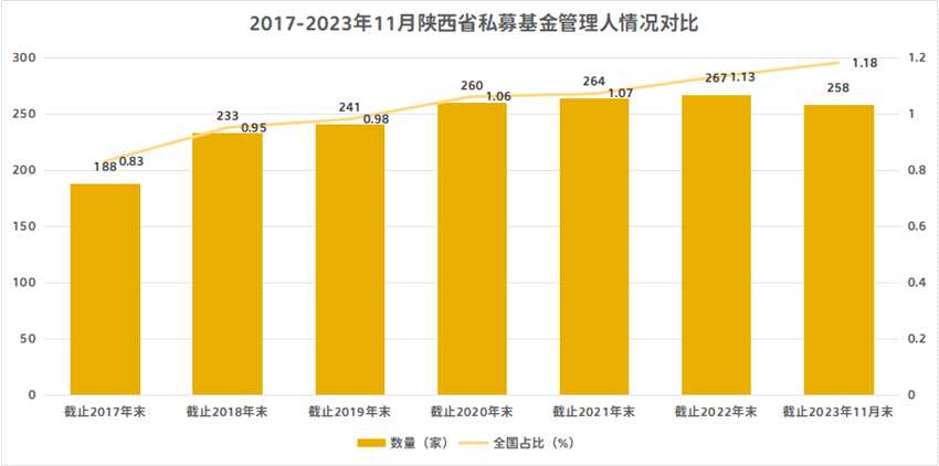 截至2023年11月末,陜西省存續(xù)登記私募基金管理人數(shù)量258,在全國(guó)占比1.18%,排名全國(guó)36個(gè)轄區(qū)第16位;