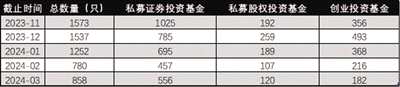 數(shù)據(jù)顯示,今年前三月,私募基金登記總數(shù)分別為1252只、780只和858只,登記規(guī)模分別為553.22億元、283.54億元和359.88億元。