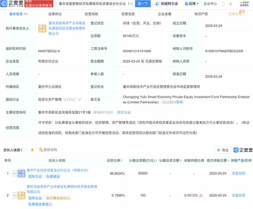 企查查APP顯示,近日,重慶渝富數(shù)智經(jīng)濟私募股權投資基金合伙企業(yè)(有限合伙)成立,出資額5.01億元,經(jīng)營范圍包含:以私募基金從事股權投資、投資管理、資產(chǎn)管理等活動。