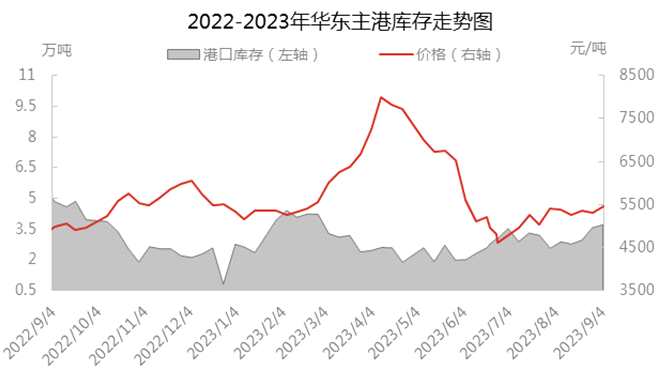 雖然港口到船較為分散,但根據(jù)跟蹤情況來看,周度到船依舊在12000噸位置附近,最高到港量可達(dá)15000噸以上,單周發(fā)貨難全部消耗,若周末船只延期則可進(jìn)出持平。發(fā)貨來看,以周度9500-10500為常規(guī)區(qū)間,小幅船貨余量累積至主港庫(kù)存,結(jié)合到船情況庫(kù)存短期難回落。