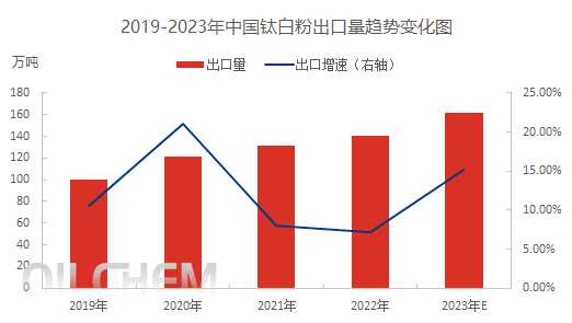 2019-2023年中國(guó)鈦白粉出口量逐年遞增,目前出口依存度達(dá)到41%。2022年出口量140.58萬噸,同比增加7.17%,為近5年高點(diǎn)。預(yù)計(jì)2023年出口量達(dá)到162萬噸,或?qū)⒃賱?chuàng)新高。隨著國(guó)內(nèi)鈦白粉的改擴(kuò)建,我國(guó)鈦白粉產(chǎn)量增長(zhǎng)率長(zhǎng)期高于表觀消費(fèi)需求增長(zhǎng)率,為了緩解這一問題,鈦白粉生產(chǎn)企業(yè)積極拓展海外市場(chǎng)。國(guó)內(nèi)鈦白粉行業(yè)隨著產(chǎn)能的增加,在國(guó)際上的位置也不斷提升,中國(guó)鈦白粉產(chǎn)能占全球產(chǎn)能的50%以上,是全球鈦白粉第一生產(chǎn)大國(guó)。國(guó)產(chǎn)的硫酸法鈦白粉在國(guó)際市場(chǎng)有價(jià)格優(yōu)勢(shì),人民幣貶值利好出口市場(chǎng),且供應(yīng)穩(wěn)定,質(zhì)量?jī)?yōu)良,市場(chǎng)份額逐漸增加。2023年,國(guó)際企業(yè)泛能拓關(guān)停了意大利和德國(guó)的兩家工廠,而后宣布申請(qǐng)破產(chǎn)保護(hù),8月科慕宣布了關(guān)閉臺(tái)灣觀音鈦白粉工廠。全球鈦白粉產(chǎn)能縮減,更加利好我國(guó)鈦白粉出口市場(chǎng)。