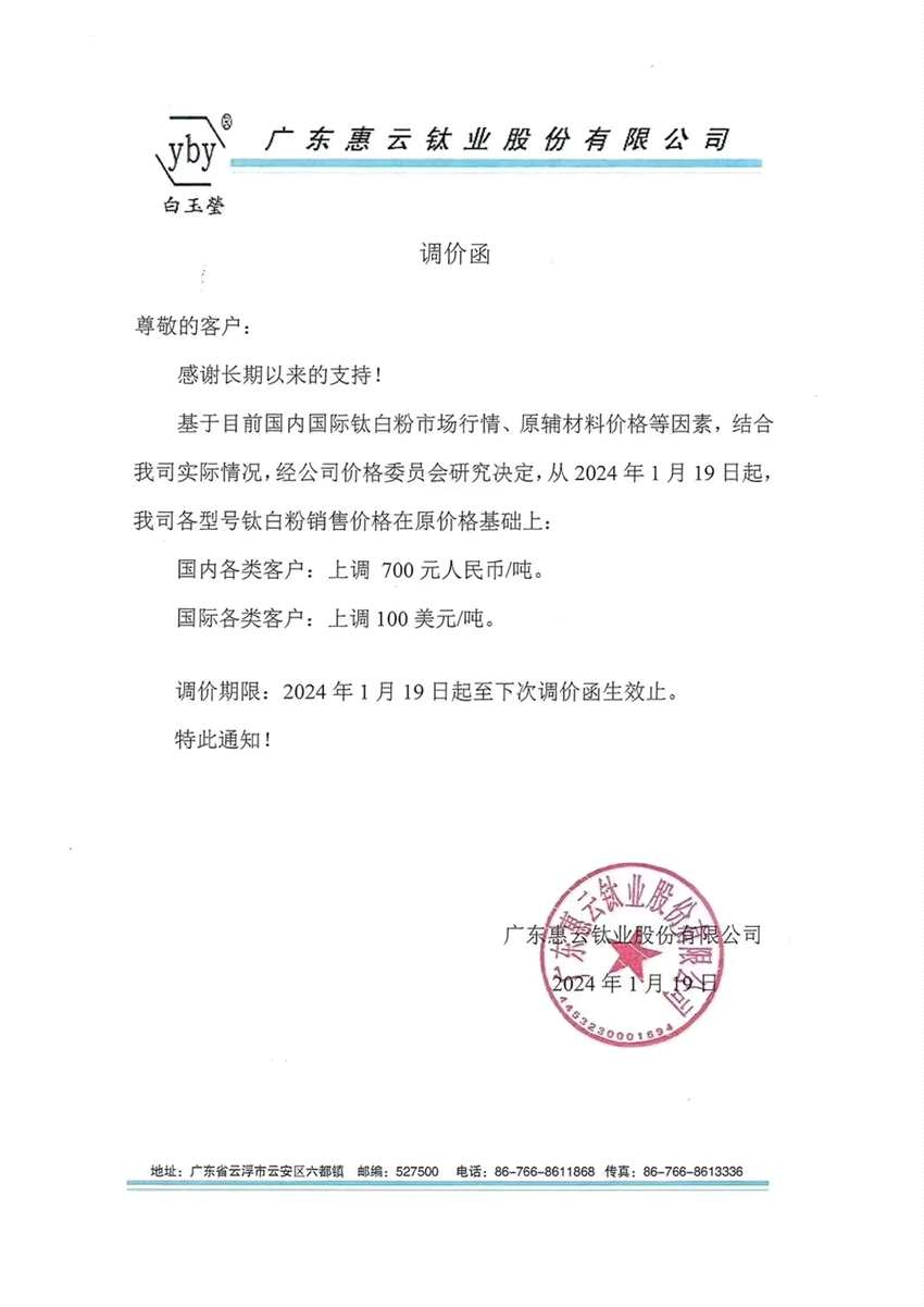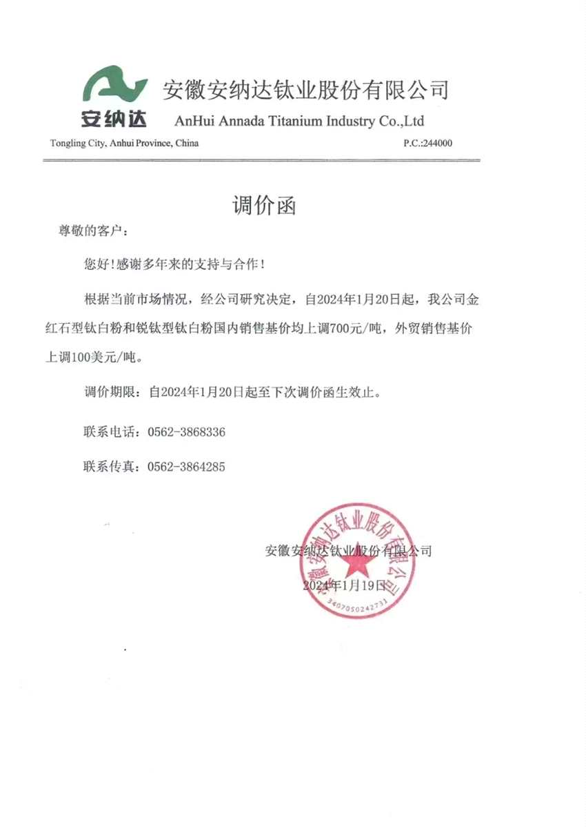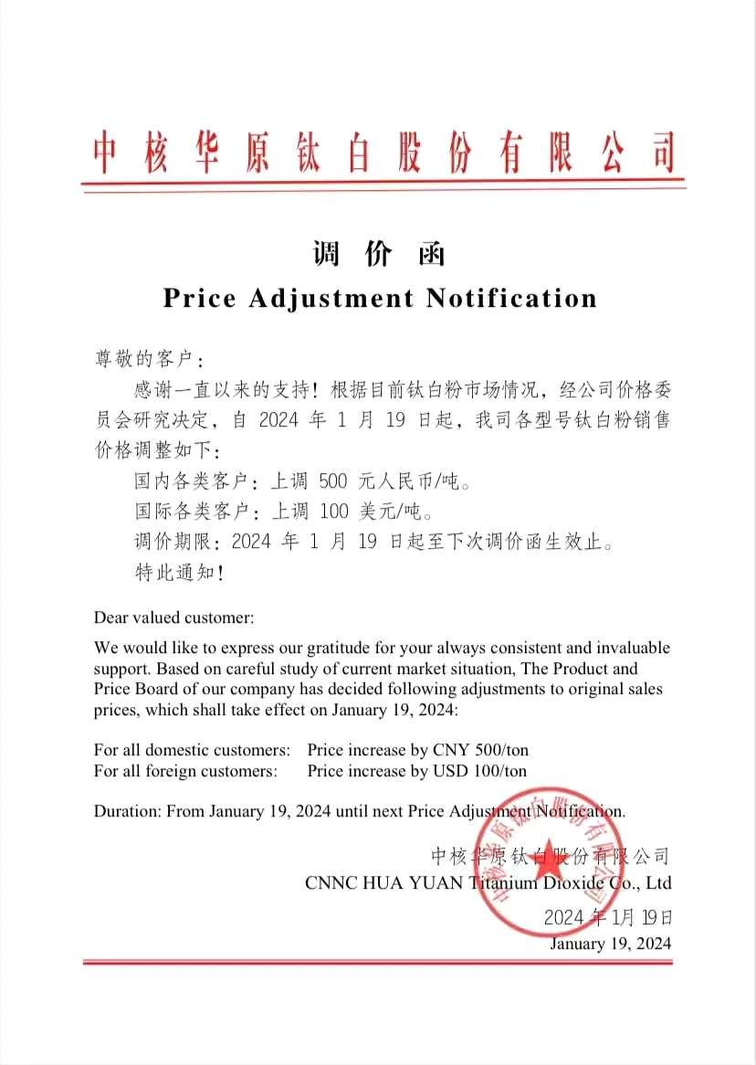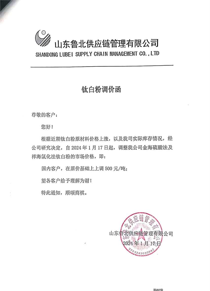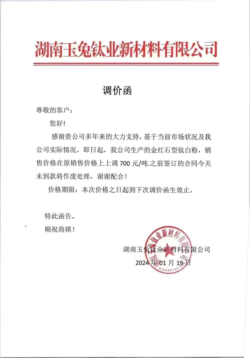 繼龍佰集團(tuán)(002601)和惠云鈦業(yè)(300891)相繼宣布漲價之后,1月22日,鈦白粉頭部廠商中核鈦白(002145)也披露公告稱,公司自2024年1月19日起,全面上調(diào)各型號鈦白粉銷售價格。其中,國內(nèi)客戶銷售價格上調(diào)500元/噸,國際客戶銷售價格上調(diào)100美元/噸。