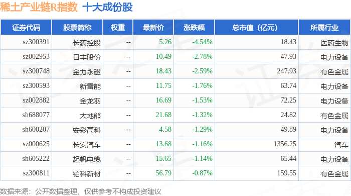稀土產(chǎn)業(yè)鏈R(489013)指數(shù)十大成份股詳情如下: