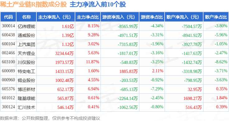 資金流向方面,稀土產(chǎn)業(yè)鏈R(489013)指數(shù)成份股當(dāng)日主力資金凈流出合計(jì)1.54億元,游資資金凈流出合計(jì)2.95億元,散戶資金凈流入合計(jì)4.49億元。成份股資金流向詳情見(jiàn)下表: