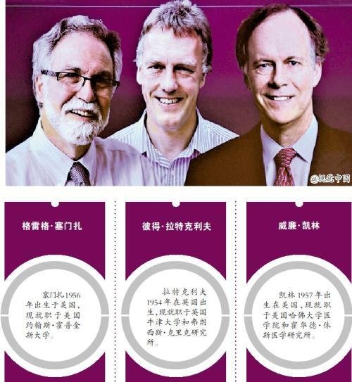 凱林1957年出生在美國,現(xiàn)就職于美國哈佛大學(xué)醫(yī)學(xué)院和霍華德·休斯醫(yī)學(xué)研究所。拉特克利夫1954年在英國出生,現(xiàn)就職于英國牛津大學(xué)和弗朗西斯·克里克研究所。塞門扎1956年出生于美國,現(xiàn)就職于美國約翰斯·霍普金斯大學(xué)。三名科學(xué)家將分享900萬瑞典克朗(約合91萬美元)獎金。 (和苗、付一鳴)