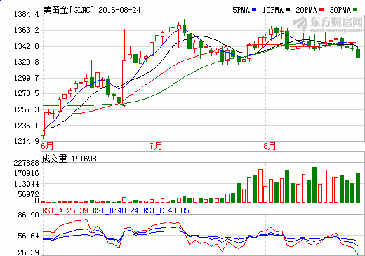 點(diǎn)擊查看行情 國(guó)際黃金期貨周三(8月24日)因美元堅(jiān)挺而繼續(xù)下挫,美市盤中最低下探至1324.31美元/盎司,預(yù)計(jì)金價(jià)在美聯(lián)儲(chǔ)主席耶倫周末發(fā)表講話前仍將大幅震蕩,市場(chǎng)正在密切關(guān)注美聯(lián)儲(chǔ)加息的政策線索。
