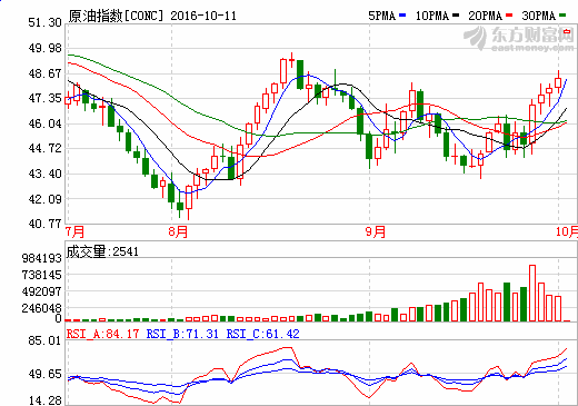 周一(10月10日),美國WTI原油11月期貨收漲1.54美元,或3.09%,報51.35美元/桶。布倫特原油12月期貨周一收漲1.21美元,或2.33%,報53.14美元/桶。國際油價探底回升并再度沖高,早些時候一度跌逾1%,隨后美原油11月期貨不僅收復(fù)50美元整數(shù)關(guān)口,并刷新四個月高點至51.10美元/桶,布倫特原油12月期貨則刷新一年高點至53.22美元/桶。