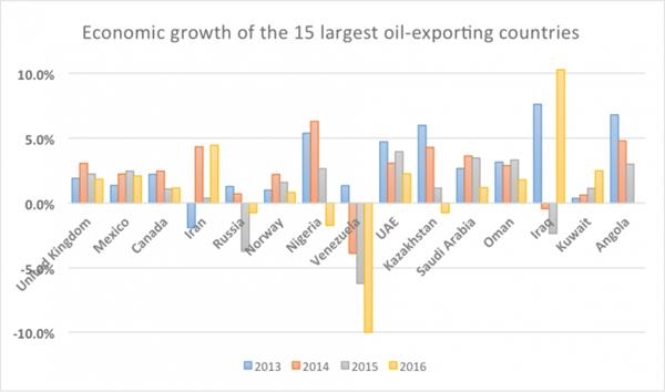 全球前十五大原油出口國過去四年經(jīng)濟(jì)增速對比圖