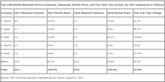 2017年第一季度,小米公司在可穿戴設(shè)備市場的份額就已經(jīng)首次超過Fitbit,根據(jù)IDC的最新報(bào)告數(shù)據(jù),第二季度小米繼續(xù)鞏固其市場第一的位置,排名第二的蘋果和排名第三的Fitbit則緊隨其后。