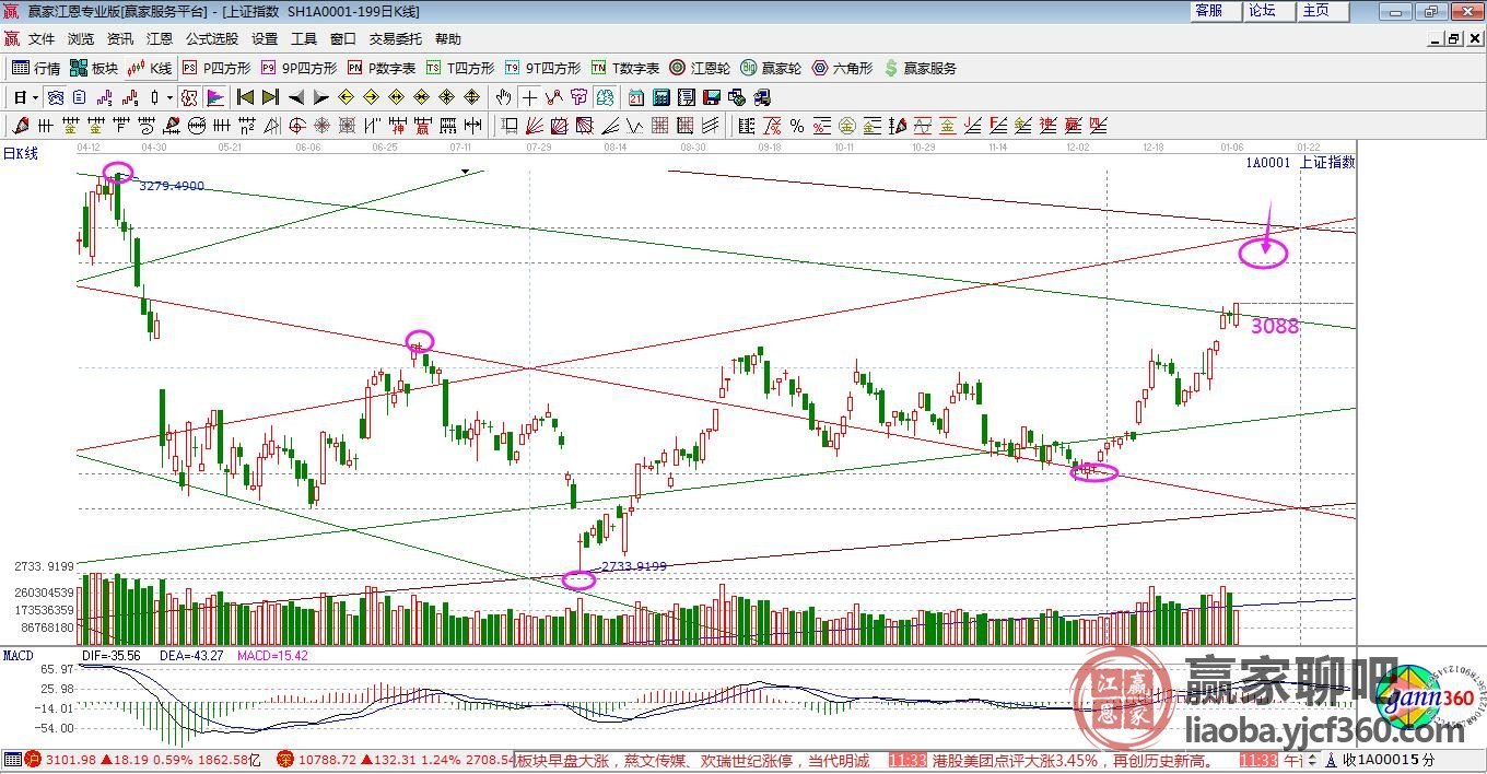 技術(shù)分析,指數(shù)略微跳空低開(kāi)回補(bǔ)確口后震蕩上攻,日K線(xiàn)保持在極反通道藍(lán)色上軌線(xiàn)震蕩,盤(pán)中收復(fù)江恩箱3*2線(xiàn)3088點(diǎn),按工具規(guī)則,站穩(wěn)此線(xiàn)上方壓力是江恩箱空間分析62.5%3156點(diǎn)及目標(biāo)位上升1*1線(xiàn),日線(xiàn)下個(gè)時(shí)間窗口是13號(hào),市場(chǎng)整體處于反攻周期。操作思路,指數(shù)延續(xù)在生命線(xiàn)強(qiáng)勢(shì)區(qū)域運(yùn)行,底倉(cāng)至5成,用3成活動(dòng)倉(cāng)做低吸高拋。